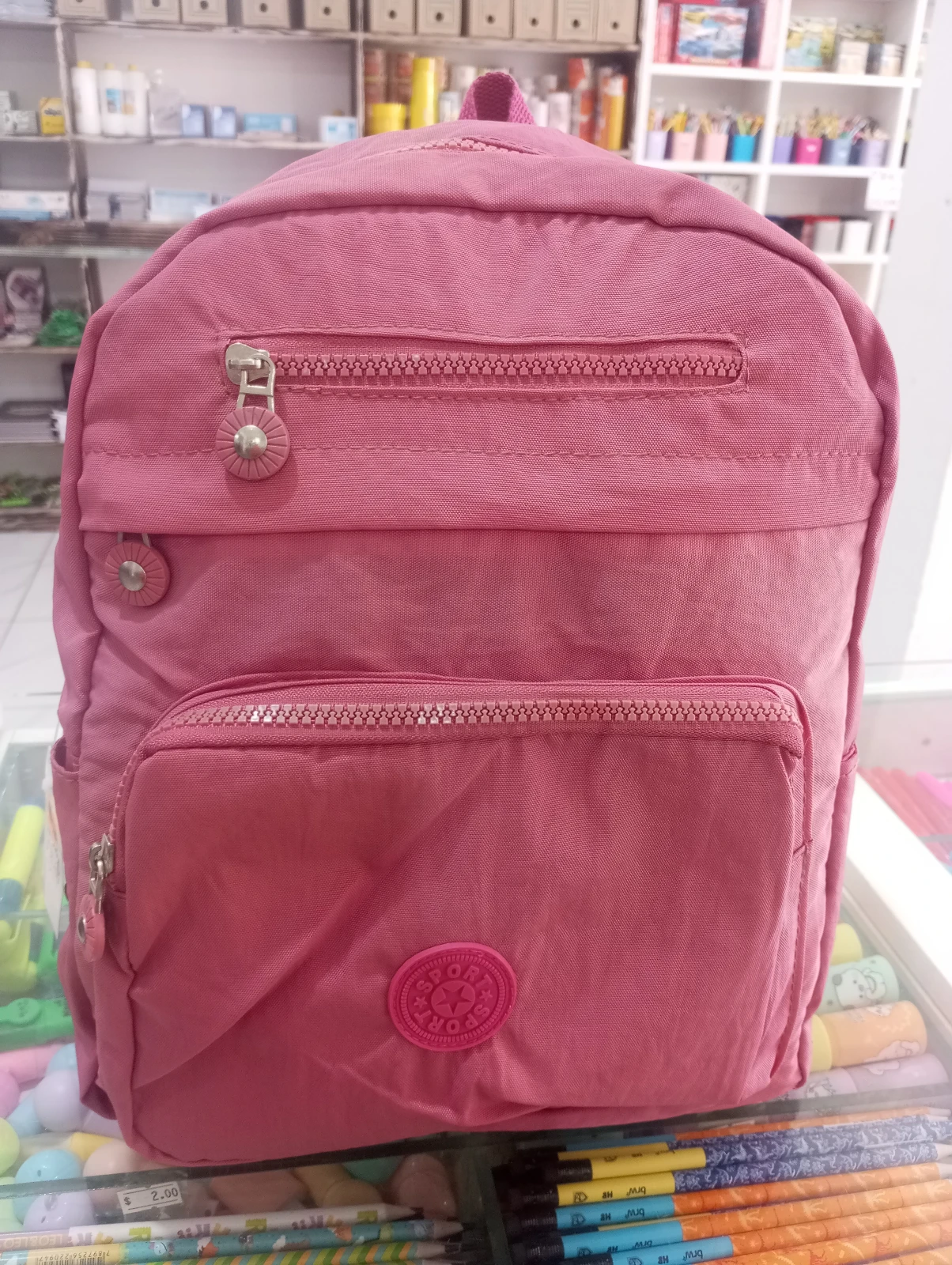 Mochila rosa compacta e resistente, perfeita para a rotina escolar e passeios. Possui compartimento principal amplo para cadernos e materiais, bolso frontal com zíper para itens menores e zíper adicional na parte externa para organização rápida.