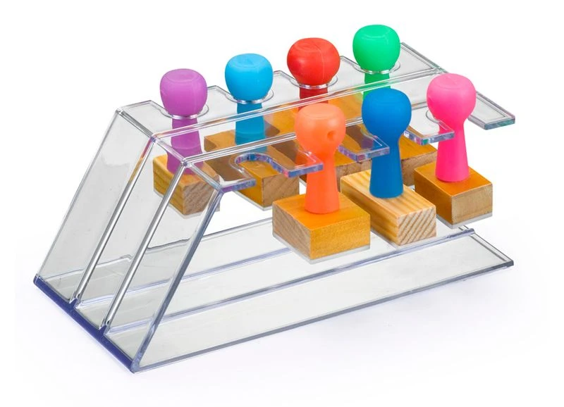 Design estável e fácil de limpar, ideal para bancada de trabalho, escola ou ateliê. Mantém seus carimbos ordenados, visíveis e acessíveis, aumentando a produtividade.